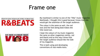 This student's music magazine product uses and develops conventions from real music magazines. Specifically, the masthead and colors are based on "Vibe" magazine. The layout of columns on the contents page and double page spreads are inspired by analyzing other magazines. Features like a large central photo on the cover and bold text at the bottom also emulate conventions from Billboard magazine and others. While influenced by real magazines, the student's own product combines and adapts different elements to create an original music magazine.