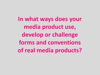 The document summarizes the front cover of a music magazine created for a class evaluation. It discusses various design elements and how they use or challenge conventions of real music magazines to attract the target audience of musically-interested young adults. Key elements discussed include the central image featuring a guitarist, colorful cover lines, placement of information, and headlines about music awards and featured artists.