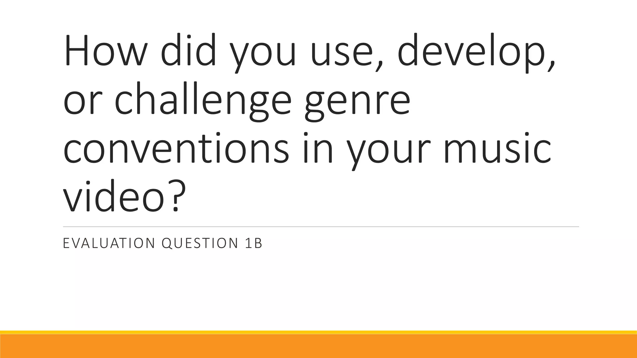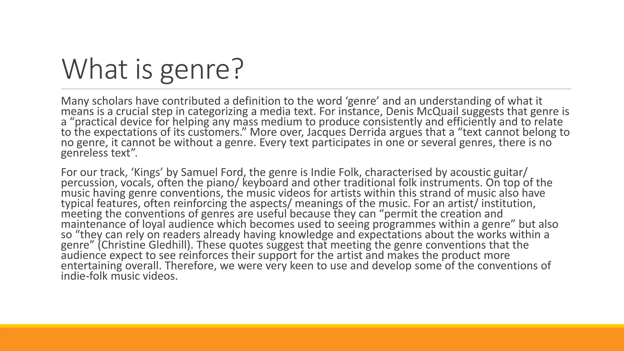 The document discusses genre conventions in indie folk music videos and how the student's music video for "Kings" by Samuel Ford did or did not follow these conventions. It provides examples of typical indie folk music video conventions like using natural settings as backdrops, incorporating themes of movement or travel, and only including a few characters to reinforce an intimate feel. The student explains how their video used these conventions through its locations, narrative of characters traveling, and only featuring two main characters. However, it also notes that some artists are challenging conventions by including performance elements and that the student could have strengthened the audience connection by having the character lip sync to the song.