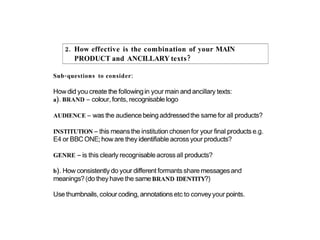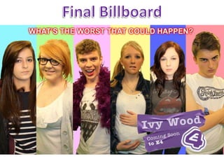 The document provides details on the design of the front cover of a magazine aimed at 16-24 year olds. It describes design elements like the masthead at the top, colored tabs for easy navigation, eye contact from the main cover star to engage readers, and references to other soap operas. It also mentions inclusion of the magazine's price, website, and social media information to further promote the content and encourage readers to explore more.