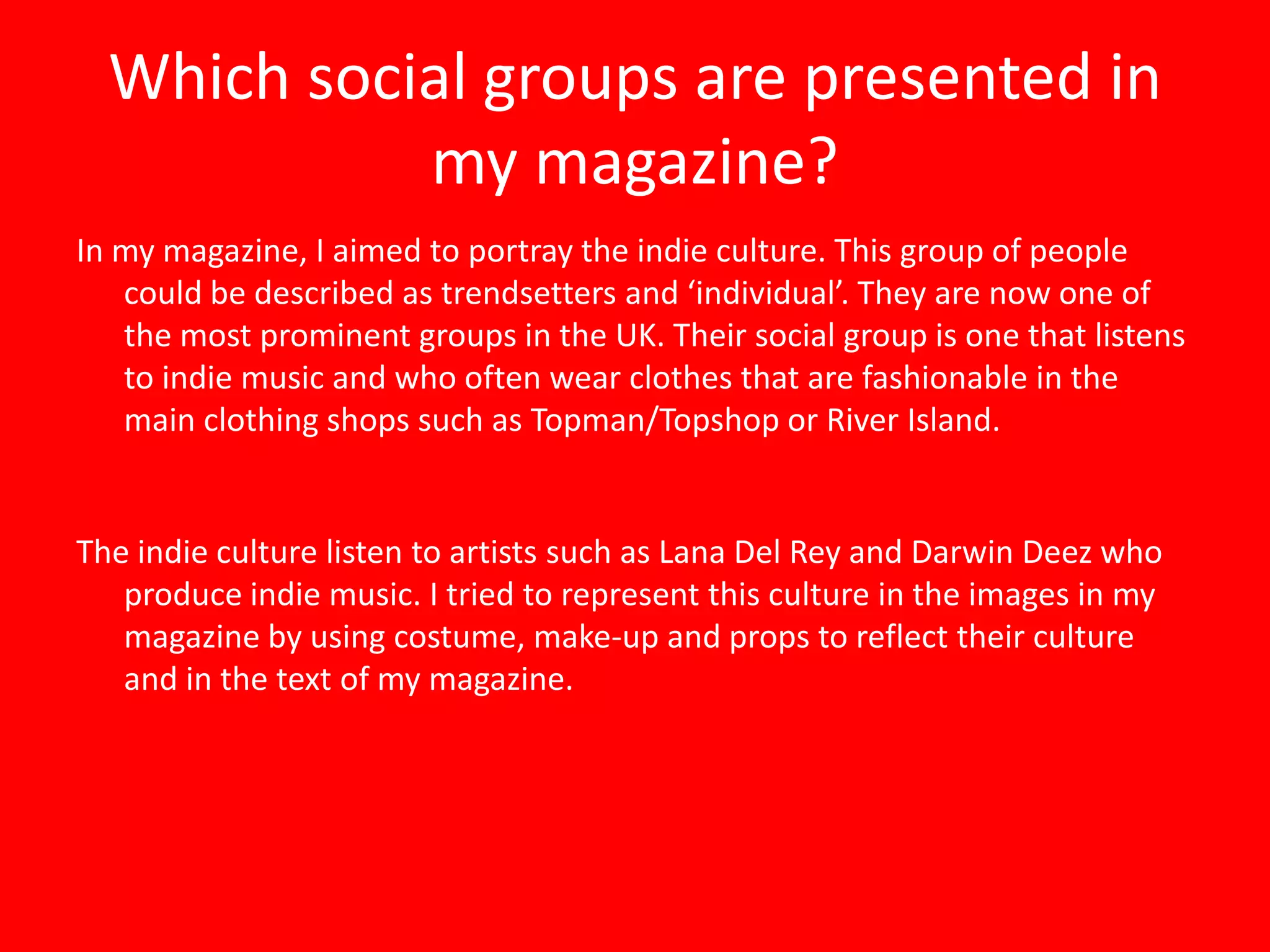 The document discusses how an indie magazine portrays the indie social group through images and text. It represents the indie culture by depicting trends in fashion, music, and lifestyle that they enjoy, such as wearing floral clothing, accessories, listening to artists like Lana Del Rey, attending music festivals, and discovering new bands. The images use techniques like costumes, makeup, props, and camera angles to reflect the culture's aesthetics and sense of uniqueness. The text also aims to appeal to indie interests through the magazine's design, featured artists, and content about music festivals.