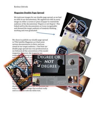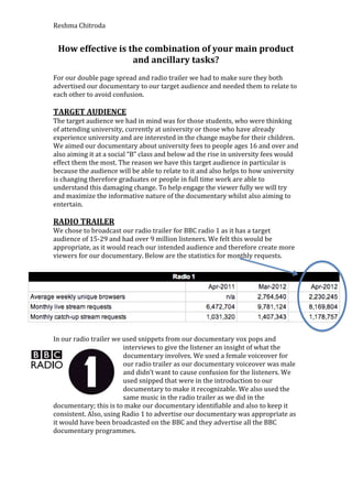 The document discusses the target audience and promotional materials for a documentary about rising university fees. The target audience was students aged 16 and over, especially those from lower socioeconomic backgrounds who would be most affected by higher fees. A radio trailer was broadcast on BBC Radio 1 to reach the target demographic of 15-29 year olds. The trailer used audio clips and music from the documentary to promote familiarity. A double page magazine spread was also created, using title-branded photos of students to relate to the target audience. It was published in TV& Satellite Magazine for its coverage of serious documentaries.