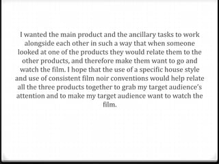 The document discusses how the poster, magazine, and trailer for a film noir work together to effectively market the film to the target audience. Key aspects that link the products include using the same font, incorporating film noir conventions like the male protagonist and gun imagery, employing black and white photography, and including social media links. Audience feedback indicated these elements grabbed attention and intrigued viewers about the genre. The poster aims to create intrigue, the trailer provides more plot details, and the magazine further promotes the film as its release nears. Together the products perform different marketing functions while cohesively addressing the target demographic.