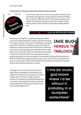 The document discusses how the magazine represents particular social groups. [1] It suggests that by advertising music festivals, the magazine targets people who like attending festivals. [2] The artists and model featured also seem to match the stereotypical interests of the target audience of female students and "hippies." [3] Elements like the casual language and inclusion of a guitar further reinforce stereotypes of the target social groups of indie/rock music fans.