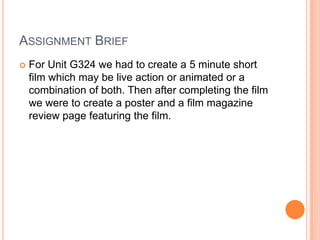 The document discusses the effectiveness of combining a short film with ancillary tasks of a poster and film review magazine page. It describes how the poster uses a close-up image of the main character to convey neutral sadness and intrigue without revealing details, following drama genre conventions. Fonts, colors, and comparisons to successful posters are also discussed. The film review aims for simplicity with a black-blue color scheme, plot summary box, and fonts that stand out subtly. Images provide context between characters. Both poster and review effectively promote the film in different ways and complete each other.