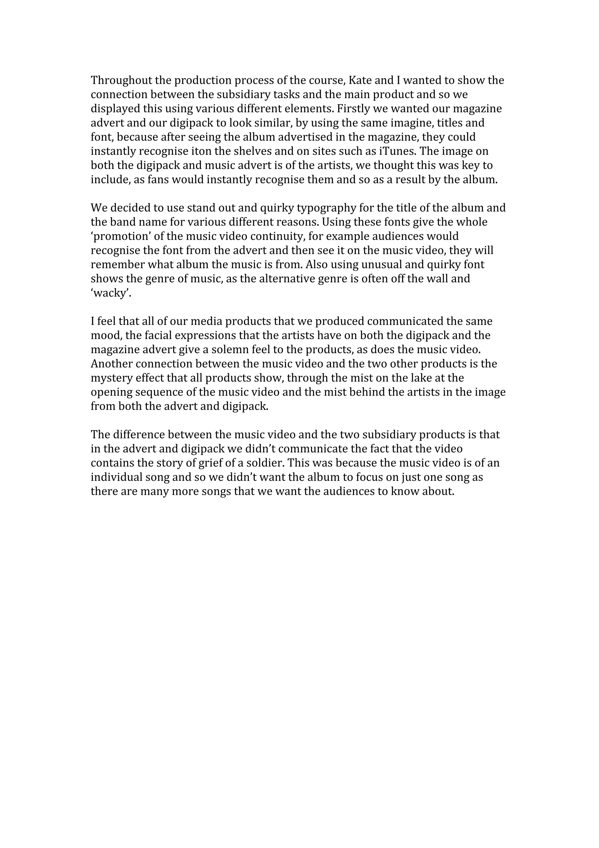 Kate and the author wanted the magazine advert, digipack, and music video for an album to look consistently connected. They used the same image, titles, and font on the advert and digipack so fans would recognize the album on shelves and websites. The image featured the artists so fans would identify them and buy the album. Standout typography was used for the title and band name on different elements to maintain continuity and recognition across promotions. While the products conveyed a solemn and mysterious mood through facial expressions and mist, the advert and digipack did not mention the music video's story of grief to avoid focusing on just one song from the album.