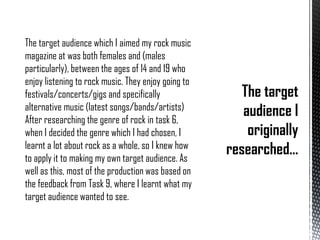 The document summarizes how the author represented different social groups in their rock music magazine targeted at 14-19 year olds who enjoy rock music. Specifically, the author focused on representing the "Indie Rock" social group through imagery and content on the cover and inside pages that embody styles and interests associated with that group, such as fashion choices and enjoyment of concerts. The author also included representation of other related groups like "Rockers" to broaden the audience.