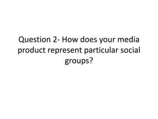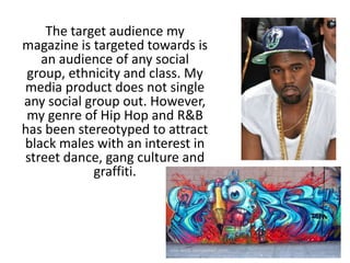 The document discusses how the media product represents social groups. It notes that the target audience and genre (hip hop and R&B) have been stereotyped to attract black males interested in street culture, but the actual audience is diverse. Models of different races and social groups were featured to show this diversity. While some mise-en-scene reflected stereotypes through props like gold chains and tattoos, issues of gender, age and social class were balanced by featuring a mix of male and female models and a price point accessible to various classes.