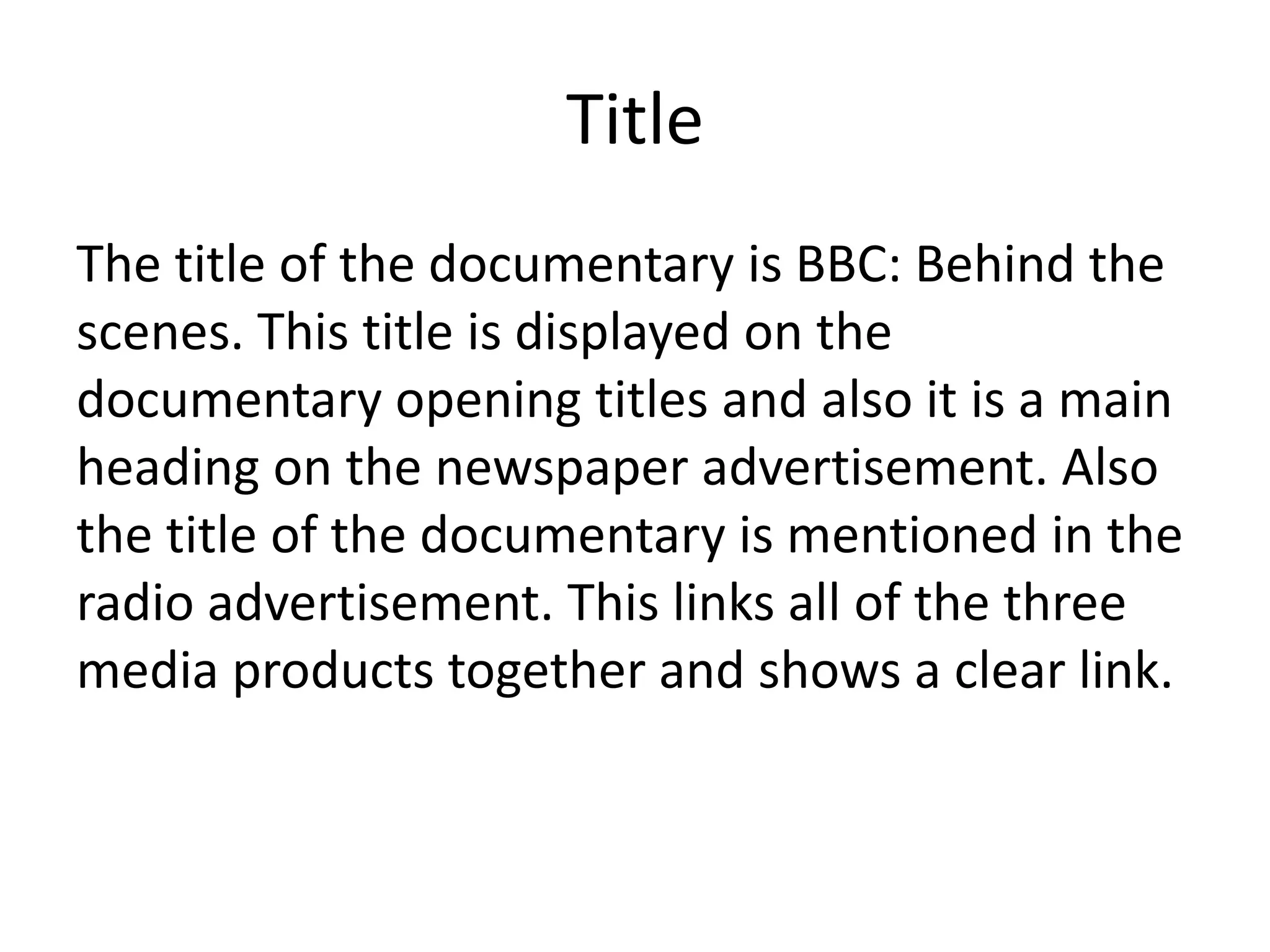 The documentary title "BBC: Behind the Scenes" was consistently displayed across the documentary's opening titles, newspaper advertisement, and radio advertisement to clearly link the three media products. The same person provided the voiceover for the documentary and radio advertisement. The radio advertisement also included clips from interviews in the documentary. The campaign slogan "See what its like to sit on the sofa" was used on the newspaper advertisement and in the radio advertisement. While the radio advertisement briefly explained what the documentary was about, all of the media provided the same key information about the documentary title, broadcast channel, and time.