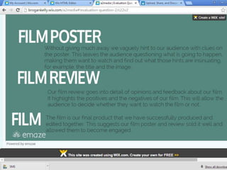 The document discusses an evaluation of a short film project. The main product is a 5-minute film about a relationship between a naive young girl and an older man that begins as a friendship but turns abusive as he demands inappropriate photos from her. Additional tasks include creating a film poster and magazine review. The poster conventions discussed include using one large main image, the film title, actors/directors names, and relating the color palette to the film's atmosphere. The review conventions discussed include a creative text in columns, images, the film name, and a quirky design.