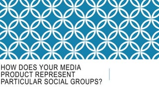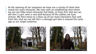 This document discusses how a media product represents particular social groups through its use of shots, mise-en-scene, props, and lack of dialogue in an opening sequence. It describes establishing shots that show the main character is a teenage girl through her clothes and face. Mise-en-scene and props like nooses, a dark cellar setting, a knife, and bottle suggest the girl's interests differ from typical teens. Plain mise-en-scene leaves the girl's thoughts unclear, intriguing the target audience as little is revealed. While dialogue is absent, focus on the girl establishes her as the main character, and listed props mark her as unusual.