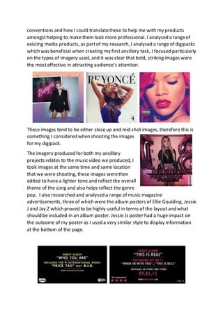 The student created two ancillary products - a CD digipack and music advertisement poster - to accompany their final music video project. They took care to establish a consistent style across all three products using similar imagery, color scheme, fonts, and layouts. This was done to clearly link the products together and make the artist and album easily recognizable. Both ancillary products effectively promoted the music and tied into themes and scenes from the music video through the use of matching photos from the shoot. The combination of products together formed a cohesive package that portrayed the narrative of the song.