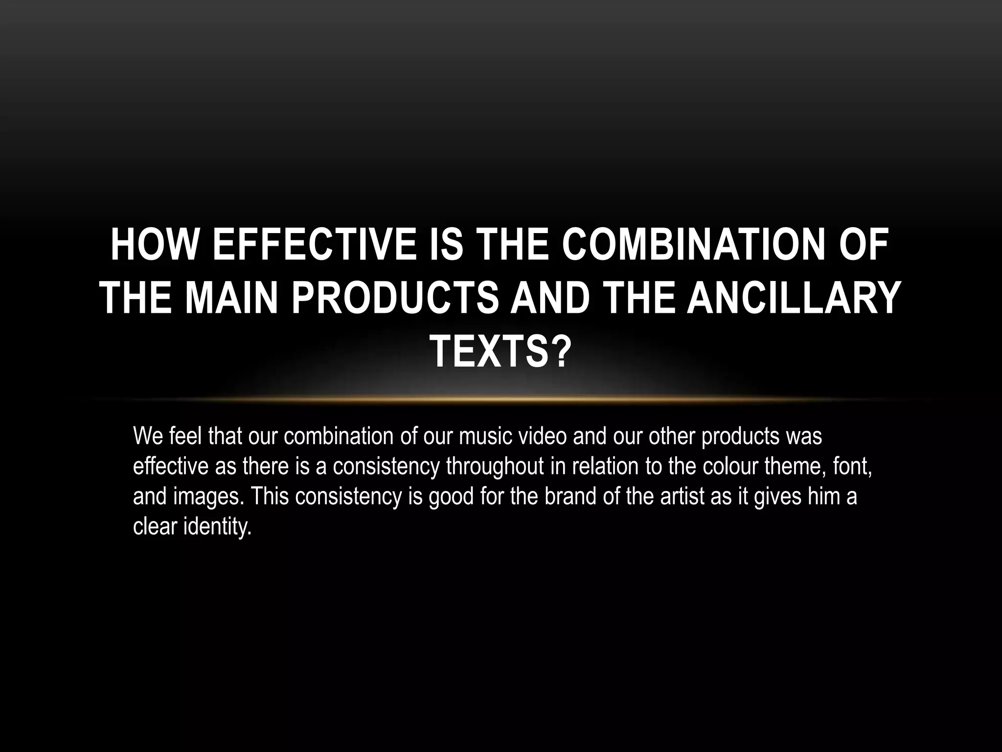 The document discusses the effectiveness of combining a music video with other products for an artist. It notes that consistency in color theme, font, and images throughout the different products gives the artist a clear identity and is beneficial for their brand. Specifically, the music video and other products used a black and white theme, a unique font, and similar images of the artist in the same outfits to clearly link the various materials together.
