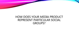 1) The document discusses how different social groups are represented in media, including social class, gender, age, mental ability, and disability.