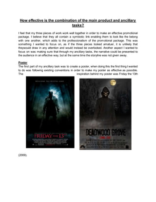 The document discusses the effectiveness of combining a main product with ancillary tasks to promote a fictional film called "Deadwood Grove." It summarizes the three promotional pieces created: a poster, magazine front cover, and trailer. The poster and front cover follow horror film conventions to look professional and promote the slasher subgenre. Features like the killer's mask and location title create consistency across pieces. While the trailer alone is most effective, the ancillary tasks enhance the overall promotional package by providing multiple exposure points for the film.