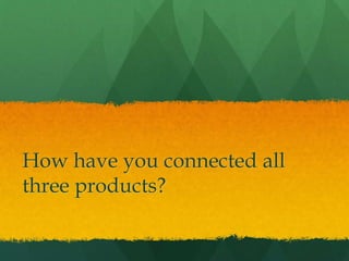 The student created three products - a music video, digipak, and magazine advert - for an artist to showcase their song. Synergy between the products was important. The artist is featured prominently in all three to connect them. Similar locations, costumes, and modern aesthetics are used. Feedback indicated the story in the video could be clearer but the ancillary products were effective in showcasing the artist. With more time, stronger location links between all three products could improve their synergy.