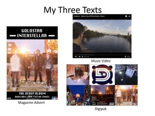 The combination of the main and ancillary texts is effective through synergy. All three products - a magazine advert, music video, and digipak - feature the same four band members and utilize nostalgic visual elements. This connects the products and brands the band as professional artists. The same font is used in the magazine advert and digipak to link them, representing the genre. Frames from the music video are also used in the digipak to link the two. Overall, consistent elements like imagery, editing style, and logo usage make the products feel cohesive and professionally made.