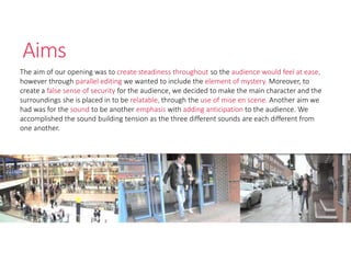 The document discusses the aims, techniques, and representation in a media product's opening scene. It aimed to make the audience feel at ease through steady camerawork but also create mystery with parallel editing. It positioned the audience to see things from the main character's perspective and relate to her through familiar settings and struggles. The main character, a teenage girl, was portrayed positively through typical clothing to be relatable to the target audience. Technical skills like parallel editing, quick shots, and mise-en-scene with relatable fashion were used to engage the audience and represent the events from the character's point of view.