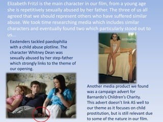 The document discusses how a media product represents social groups through its main character Elizabeth Fritzl, a woman who was repeatedly sexually abused by her father from a young age. It analyzes two other media representations of similar themes: a storyline in Eastenders about a character named Whitney Dean who was abused by her stepfather, and a charity advertisement about child prostitution. Both provided examples of how to represent the vulnerability and innocence of Elizabeth's character as a sexually abused child.