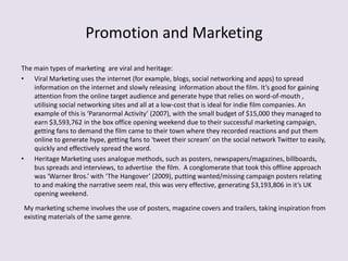 The document discusses effective marketing strategies for a film, focusing on viral marketing which leverages the internet for low-cost promotion, illustrated by the success of 'Paranormal Activity,' and heritage marketing with traditional methods seen in 'The Hangover.' It outlines the author's marketing scheme for their own film, drawing inspiration from romance films for poster and magazine cover designs, while noting specific design elements such as typography and color schemes. The author expresses concerns about the unconventional ghostly effect used in the poster and magazine cover that may confuse the audience regarding the film's romantic genre.
