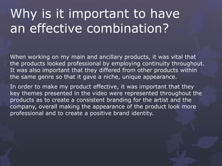 The document discusses the importance of consistency between a main product and ancillary texts. It analyzes how the overarching themes of freedom, self-expression and sexuality from an artist's music video were represented in the digipak and magazine advert through imagery like facial expressions, rainbow motifs, and typography. Maintaining continuity of themes, imagery and fonts across products creates a cohesive brand identity for the artist and company.