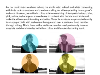 The document discusses the effectiveness of combining a music video, digipak, and poster for a band. The music video uses a black and white scheme with four pastel colors representing each band member. This color scheme is continued in the digipak layout and design. However, the poster only uses black and white to appear crisper and appeal to a wider audience. Overall, the imagery, themes, and representation of the band remain consistent across products while allowing for variation to suit each format.