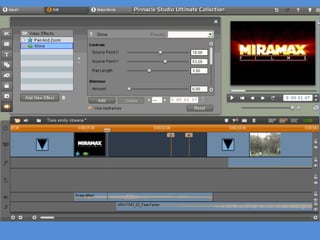The document discusses the software and equipment used to create a film trailer. Pinnacle HD15 was used for editing shots, color correction, and special effects like strobing titles. The shine effect tool in Pinnacle was used to add a fiery glow to the Miramax logo. Editing techniques like match cuts and jump cuts were employed. A camera and tripod captured steady shots, while Blogger, Vimeo, and Slideshare hosted content online. Wix created a website for the film, and Fireworks a movie poster, though Photoshop may have been better suited. While the technology enabled varied shots and online distribution, Pinnacle occasionally crashed without saving work.