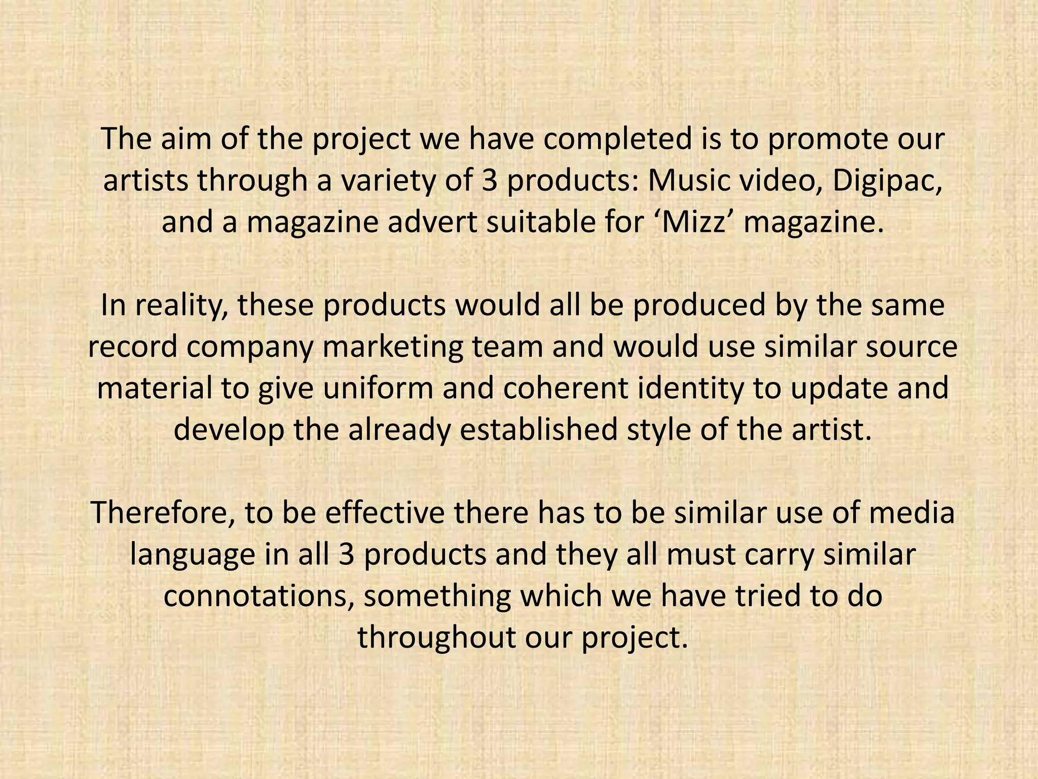 The document discusses how the group created three products - a music video, digipac, and magazine advert - to promote their artists. They aimed to give a uniform identity across the products by using similar visual languages, codes, representations, and images. This included consistent facial expressions, poses, colors, fonts, lighting, camera angles, and props. The goal was for the products to be effectively combined and attract their target youth audience.