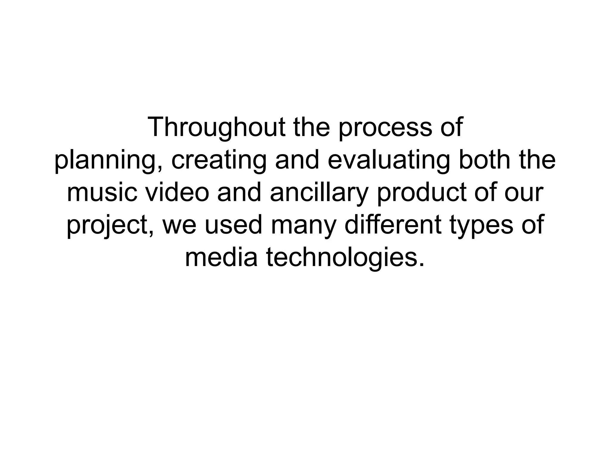 Throughout the project, the student used various media technologies for planning, construction, and evaluation. For planning and research, they used Blogger to document their process, YouTube to research other music videos, and iPods to research album artwork. Photoshop was used to create the album cover and advertisements, while a still camera captured photos. A JVC camera and flip cameras were used to film the music video, and Final Cut Pro was used to edit it. Phones collected audience feedback during screenings, and Prezi was used to reflect on the work.