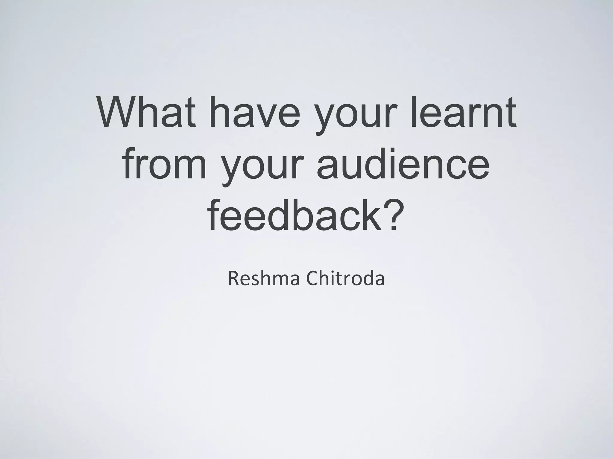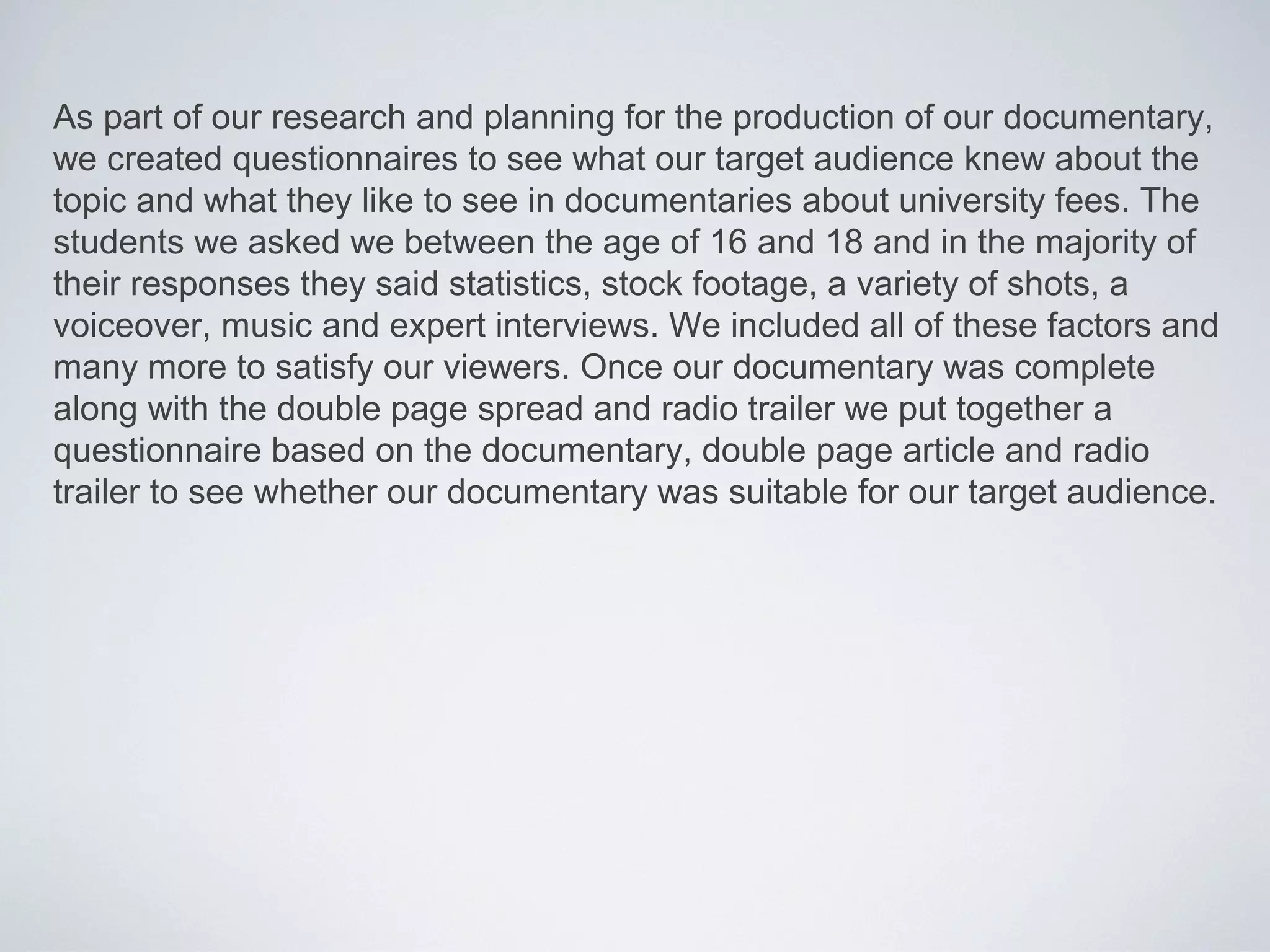 The document summarizes feedback from questionnaires given to the target audience of 16-18 year olds about a documentary, radio trailer, and double page spread created by the author. The feedback was overwhelmingly positive, with most respondents rating the enjoyment and professionalism of the documentary, radio trailer, and double page spread as 9 or 10 on a scale of 1 to 10. Respondents also agreed that the use of interviews, music, voiceover and variety of shots in the documentary kept them entertained and informed. This positive feedback validated that the author had successfully created media following conventions of the genres to appeal to and inform the target audience.