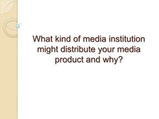 IPC Media would be a good media institution to distribute my magazine. IPC is one of the leading media publishers in the UK, having successful experience publishing magazines targeting similar audiences. IPC publishes content across multiple platforms, including print, online, mobile and tablets. They are also able to reach a large audience, engaging 26 million UK adults. Their award winning websites reach over 25 million users globally each month.