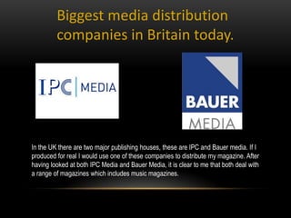 The document discusses potential media distribution companies in the UK for a new music magazine. It analyzes the two major publishing houses, IPC and Bauer Media, which both distribute magazines with similar target audiences of 15-34 year olds. Specifically, Bauer Media distributes Q Magazine, which has a circulation of 80,418 copies and targets a slightly older audience than NME Magazine. The document concludes that Bauer Media would be the preferred choice to distribute a new music magazine targeting 16-25 year olds, as they have experience targeting the desired demographic. An alternative option would be to independently publish the magazine, citing the success of MixMag as an example.