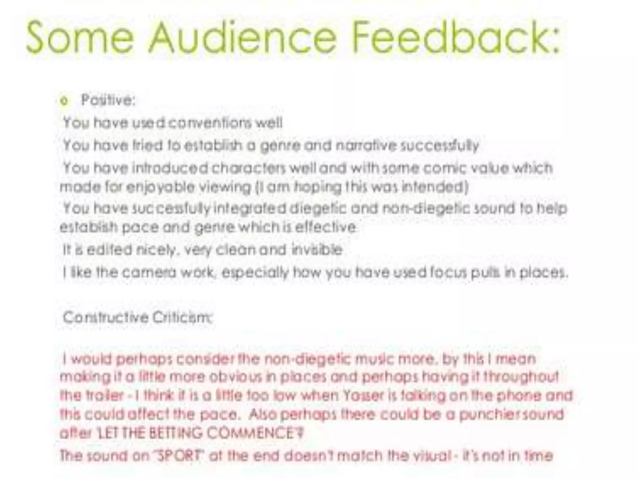 The document discusses audience feedback received about a movie trailer called "The Blood Sport".