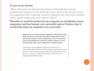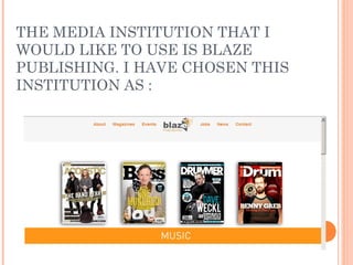 Blaze Publishing would be an ideal media institution to publish the writer's new music magazine "Live Lounge". Blaze has experience with similar magazines like "Acoustic" and is the largest independent publishing company specializing in music. They also host acoustic music events, providing opportunities for promotion and industry contacts. As experts in this field with a proven track record of success, notably with "Acoustic Magazine", Blaze would be well positioned to maximize the chances of "Live Lounge" succeeding as well.