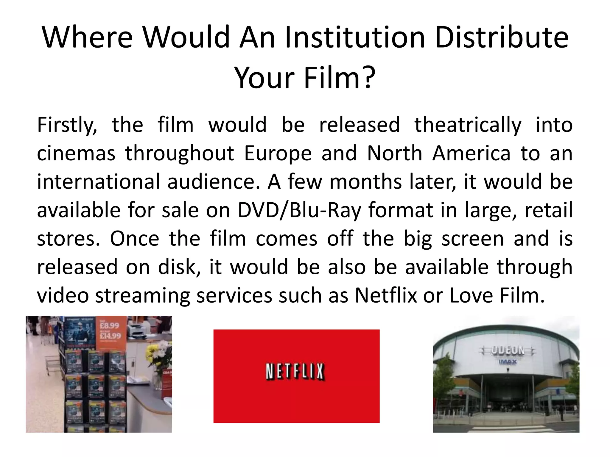 The document discusses potential options for distributing an independent film without major production backing. It suggests using free platforms like YouTube and social media to promote the film globally. It also proposes submitting the film to local and national film festivals to gain attention from potential distributors. Finally, it recommends looking to British film companies like DNA Films, Heyday Films, BBC Films, or Warp Films for potential distribution, as they have experience distributing similar genres to the proposed film.