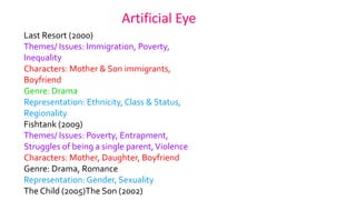 This document summarizes information about four film distribution companies - Artificial Eye, Verve Pictures, Vertigo Films, and Pathé Distribution. It provides details on the values, exhibition practices, target audiences, and representative films for each company. The common themes and representations across their films are noted. At the end, it proposes that the fictional film "The Woman Who Was Never Seen" would be a good fit for Vertigo Films due to its genre and lack of common themes with the other distributors' example films. The document analyzes the distributors' approaches to determine which would be most suitable.