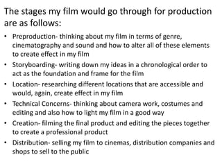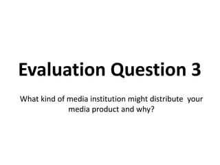 The document discusses potential media institutions that could distribute the film. It analyzes three potential distributors: Columbia Pictures, 20th Century Fox, and Film 4. Columbia Pictures and 20th Century Fox are suggested because they have distributed similar genre films in the past, including horror and thriller titles. Film 4 is also proposed because while it distributes a variety of genres, it focuses on independent films, and the narrator's film has elements of an independent film by challenging conventions. In the end, any of these three distributors could potentially help the film reach audiences in theaters, on television, and other platforms.