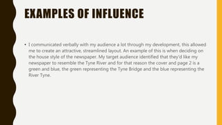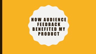 The document discusses how audience feedback benefited a product. Specifically, it allowed the creator to: 1) Design an attractive and streamlined layout resembling the Tyne River to appeal to the target audience. 2) Include more celebrity gossip stories to attract a younger and more diverse female audience, rather than only football stories. 3) Change the image on page 2 to better suit the article and differentiate from the cover image. The new image focused on the subject during her time on a singing competition show.