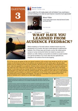 Whilst completing their first draft, the filmmakers found audience feedback to be key to developing their music video product. They used surveys on Survey Monkey before and during the drafting process to gather feedback on aspects like music genre, clothing, location, pacing of edits, and ways to improve. Sharing the surveys on social media like Facebook allowed them to reach a wider target audience of 15-30 year olds. This feedback helped inform the infrastructure and analysis of their music video.