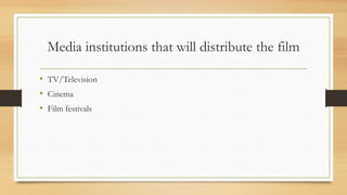 This document discusses potential media institutions for distributing a film, including TV/television, cinemas, and film festivals. It provides examples of the types of films typically shown on each medium: television shows popular movies and television shows, cinemas showcase new major releases, and film festivals screen a variety of films including smaller national and independent titles. The document suggests that a film featuring a psychological thriller opening sequence would most likely be shown at a film festival in order to showcase specialized local or smaller productions.