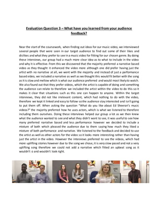 1) The group interviewed people in their target audience to understand preferences for music videos. They learned that most preferred a narrative to just a performance, so included both.