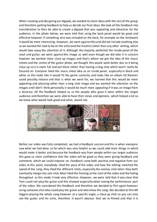 2) Feedback on their initial video suggested improving the guitar playing scene. They re-filmed with a better player but at an angle to disguise this. Feedback also led them to add more footage to lengthen the video.