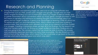 During the research and planning stages, the student used various online tools like Google, Prezi, PowerPoint, and Blogger to conduct research and organize findings. Video footage from interviews and initial pitches were captured using a camera to allow review.
