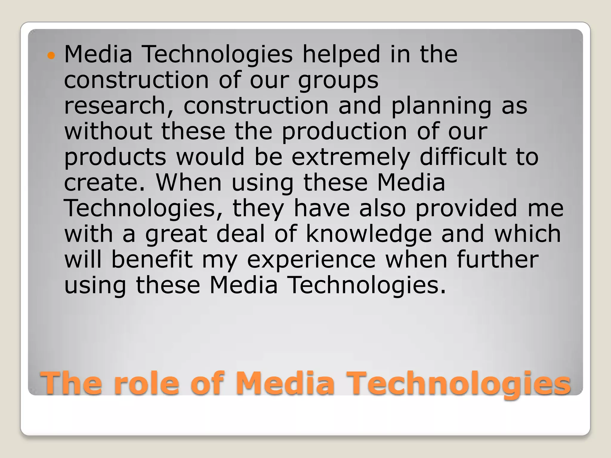 The document discusses how various media technologies were used at different stages of creating a film trailer. Photoshop was used to design print materials and film titles. Final Cut Express was used to edit footage and create the trailer. iMacs provided necessary software and storage. Other software like Prezi, PowerPoint, and Blogger helped with research, planning, and evaluation. YouTube, Facebook, and surveys gathered audience feedback. GarageBand created the soundtrack. Cameras and tripods captured footage professionally.