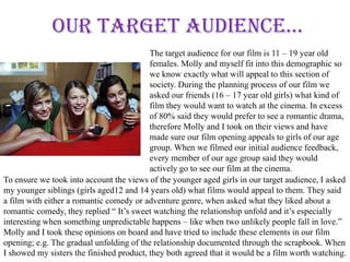 The target audience for the film is 11-19 year old females. To understand what this audience wants, the creators asked friends in this age range what kind of film they would want to see. Most said they preferred romantic dramas. Younger sisters aged 12-14 also provided input, saying they liked romantic comedies or adventure films, especially when an unpredictable relationship develops. The creators incorporated these elements, like gradually unfolding a relationship through a scrapbook, into the film opening.
