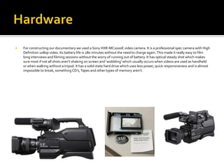 The document describes the various software, hardware, and tools used to create a documentary about music consumption over the past 10 years. A Sony video camera was used to film interviews. Adobe Premiere Pro was used to edit footage and add effects. A Dell computer with an i7 processor was used for editing. External microphones captured interview audio separately from camera audio. Adobe Photoshop created name bars and posters. Microsoft Word and Excel aided planning and data analysis. Web browsers accessed research and YouTube footage. Blogger hosted work documentation.