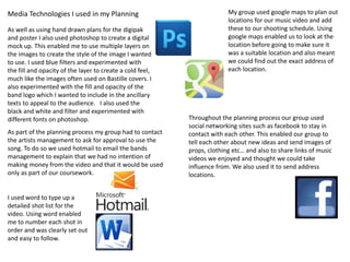 1) The document discusses the various media technologies used at different stages of a coursework project on music videos, including using Blogger to document research and evaluation, YouTube to analyze music videos, SurveyMonkey for audience research, Google Maps and social media for planning, a DSLR camera and Adobe Premiere for production, and YouTube, Facebook, and SlideShare for evaluation.