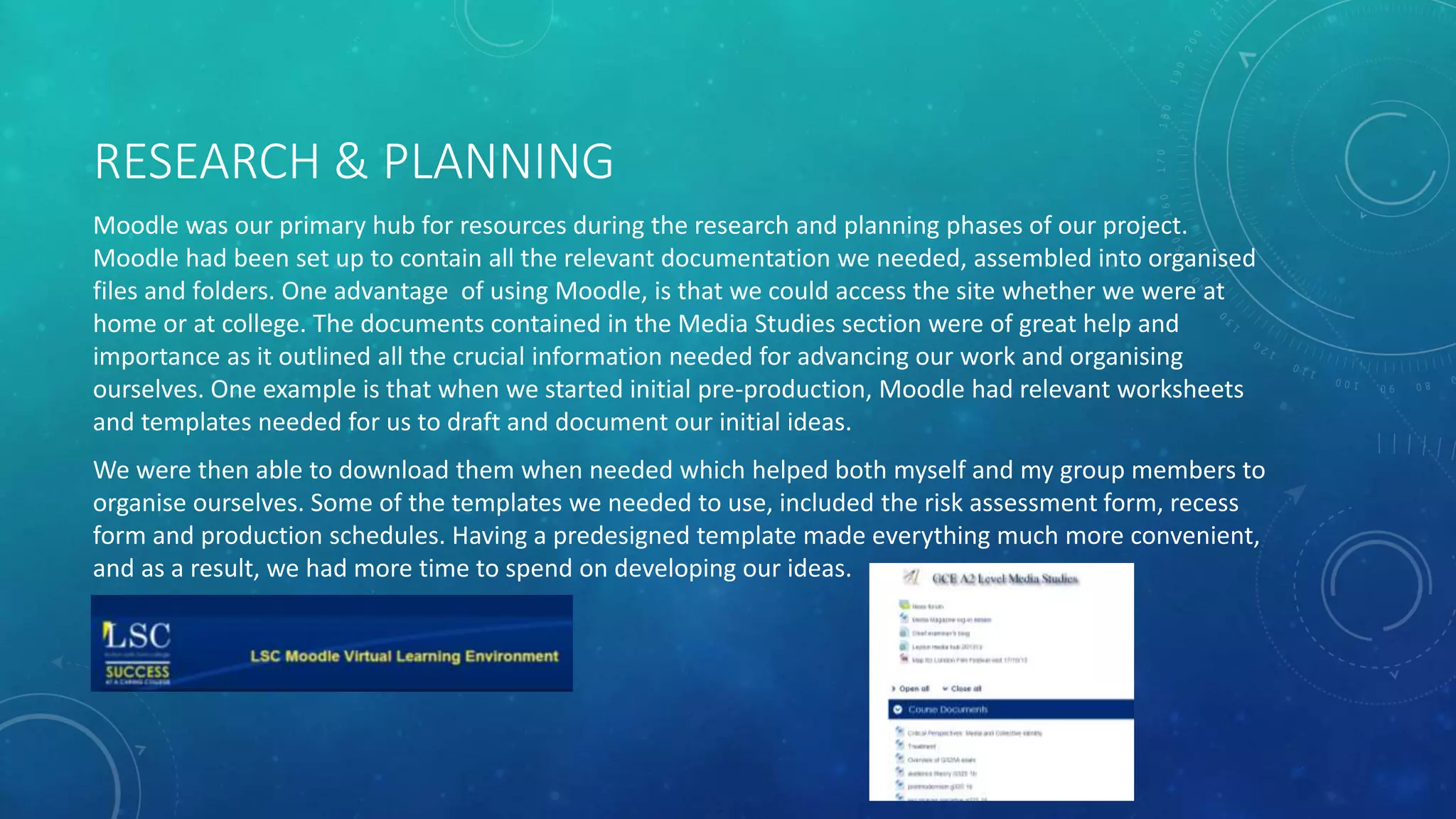 - Moodle, Microsoft PowerPoint, Google, YouTube, and Dropbox were used for researching concepts, organizing documents and files, sharing work, and presenting ideas during early stages.