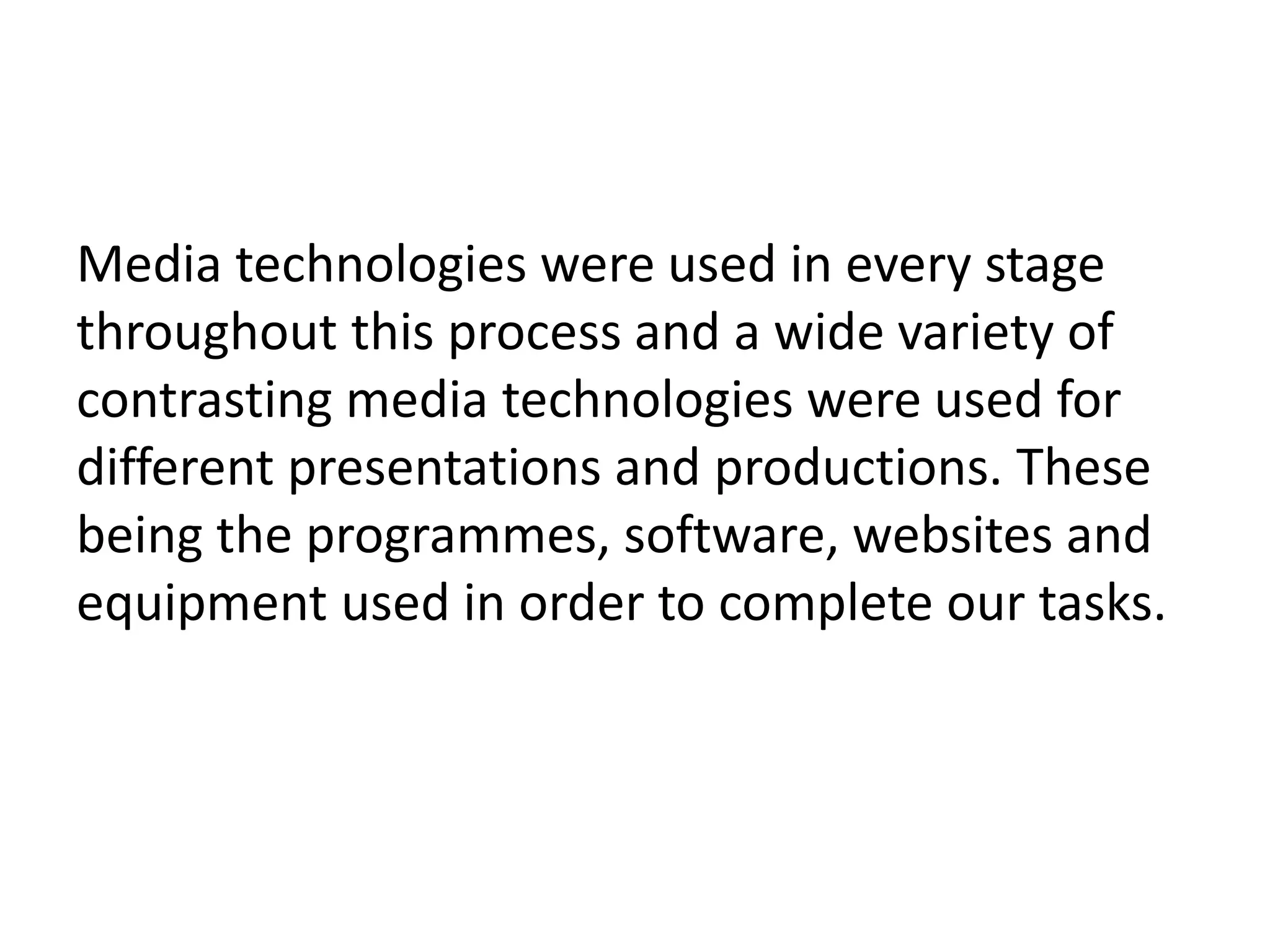 Media technologies were used throughout all stages of the process, including blogging, YouTube, Slideshare, Prezi, Photoshop, camera equipment, and Apple Final Cut Pro X. Blogger was used to document the process. YouTube was used for research and embedding videos. Slideshare and Prezi were used to create professional-looking presentations. Photoshop was used for ancillary tasks and research. A Canon EOS600D camera captured high-quality footage. Tripods ensured steady shots. Final Cut Pro X was used to edit the documentary footage with voiceovers, effects, and cuts.