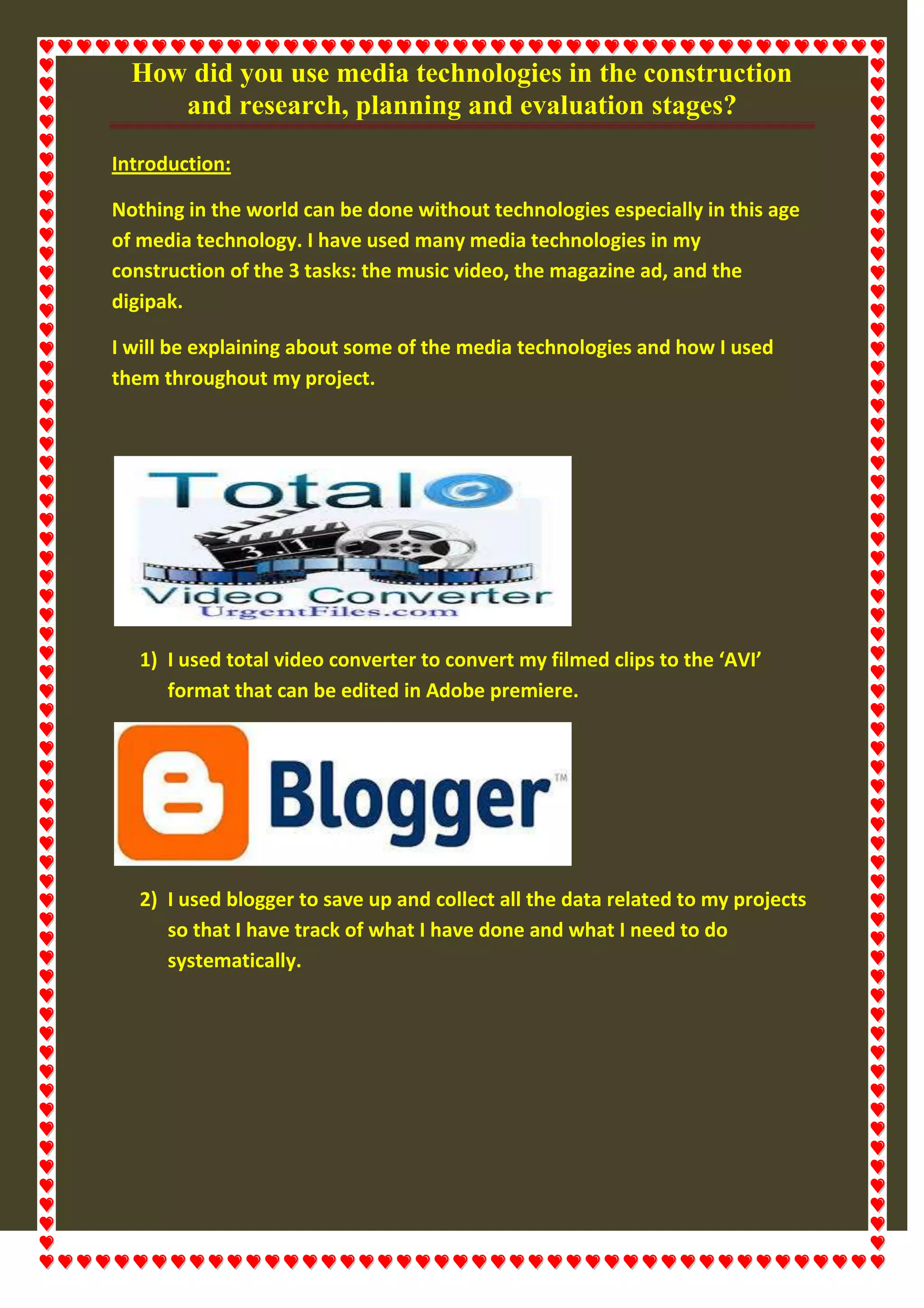 The document discusses the various media technologies used at different stages of the author's media project, which included creating a music video, magazine ad, and digipak. The author used technologies like Total Video Converter, Blogger, a PTCL EVO USB, keyboards, mobile phones, an HP computer, Adobe software, Corel Draw, Windows Movie Maker, an HP laptop, Microsoft PowerPoint, Windows Media Player, YouTube, MixPad, Microsoft Word, Google, Mozilla Firefox, Dailymotion, Vimeo, ProShow Producer, Windows Photo Viewer, and professional cameras. These technologies helped with tasks like video editing, data collection, internet access, audio/video production, presentation creation, and viewing/